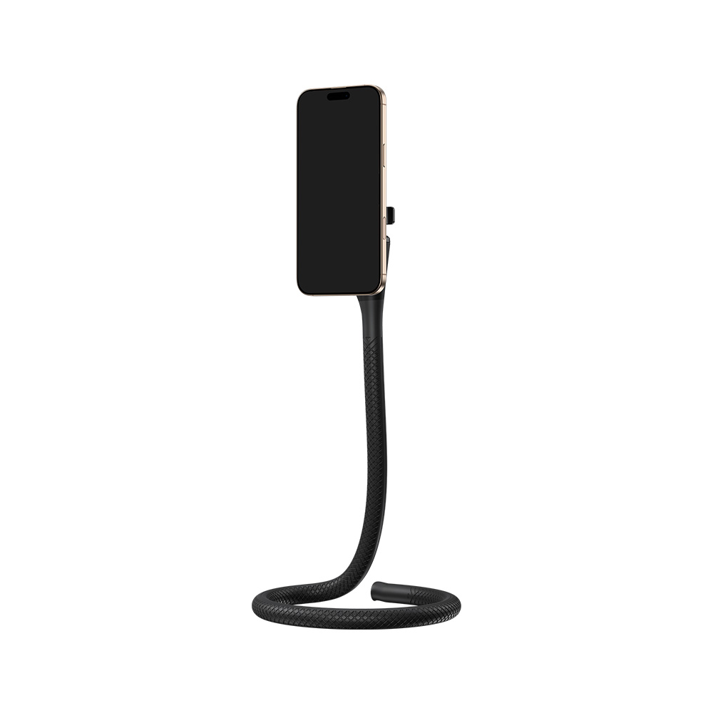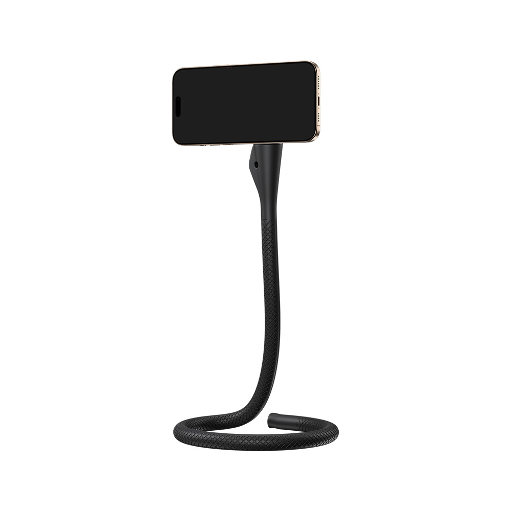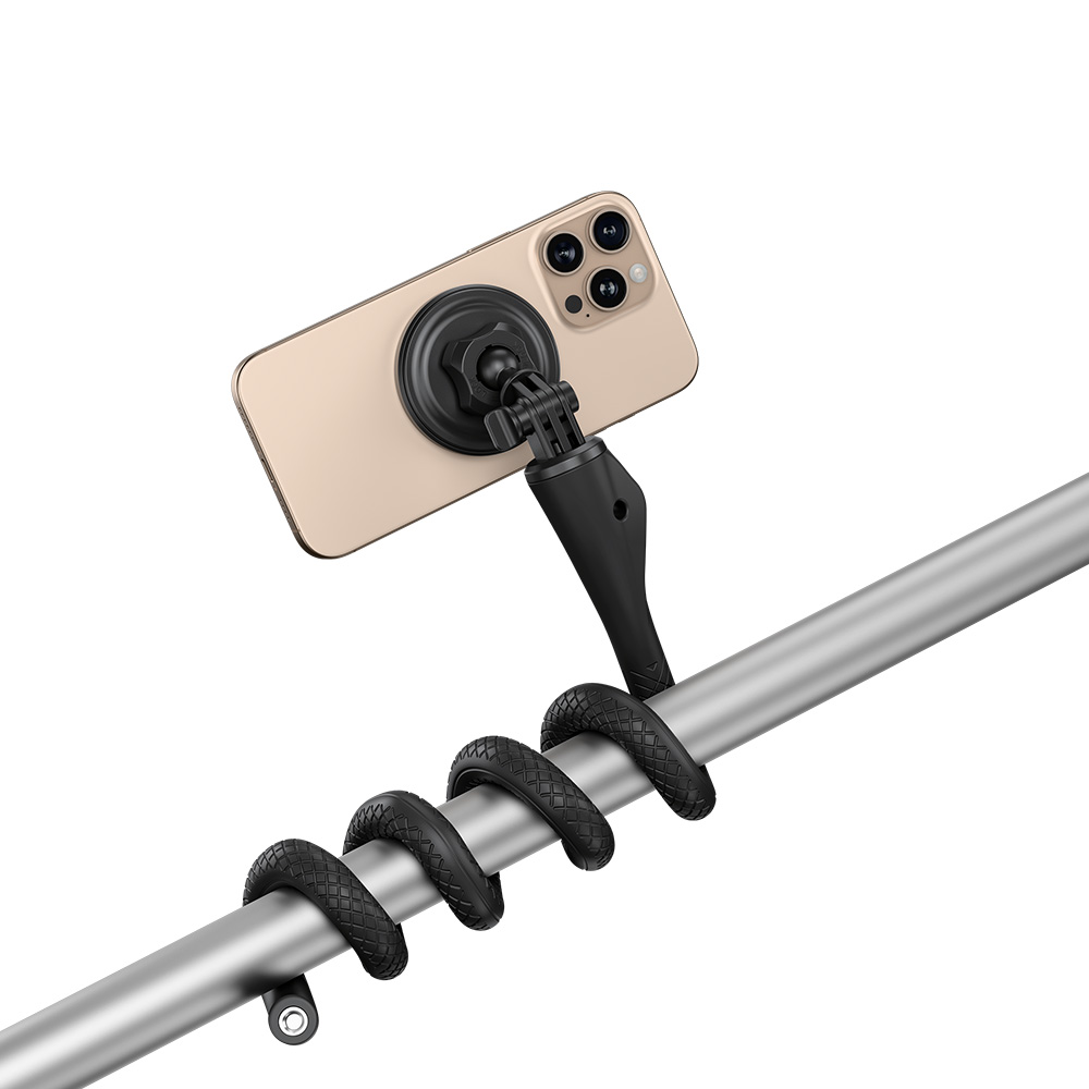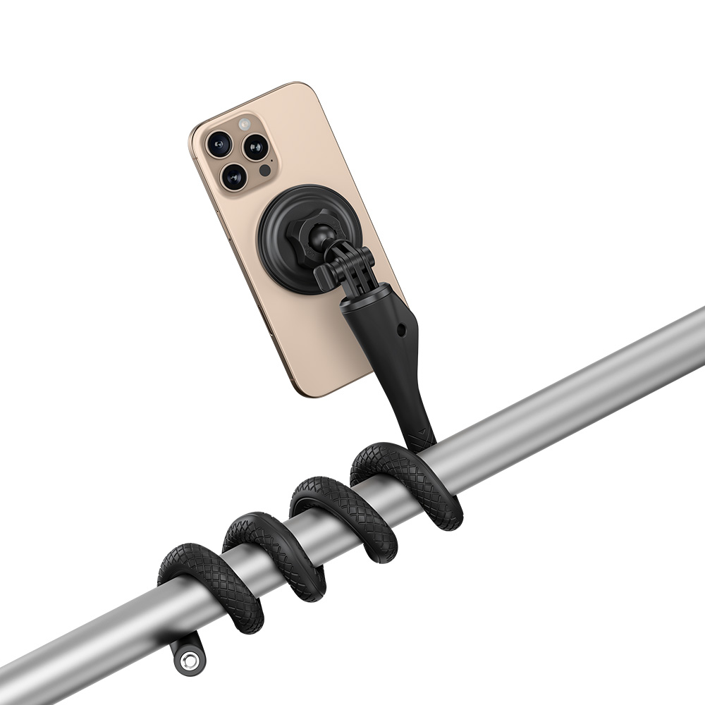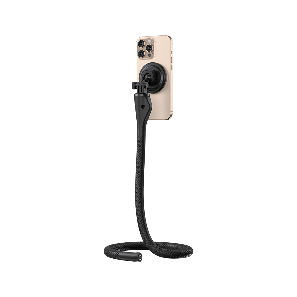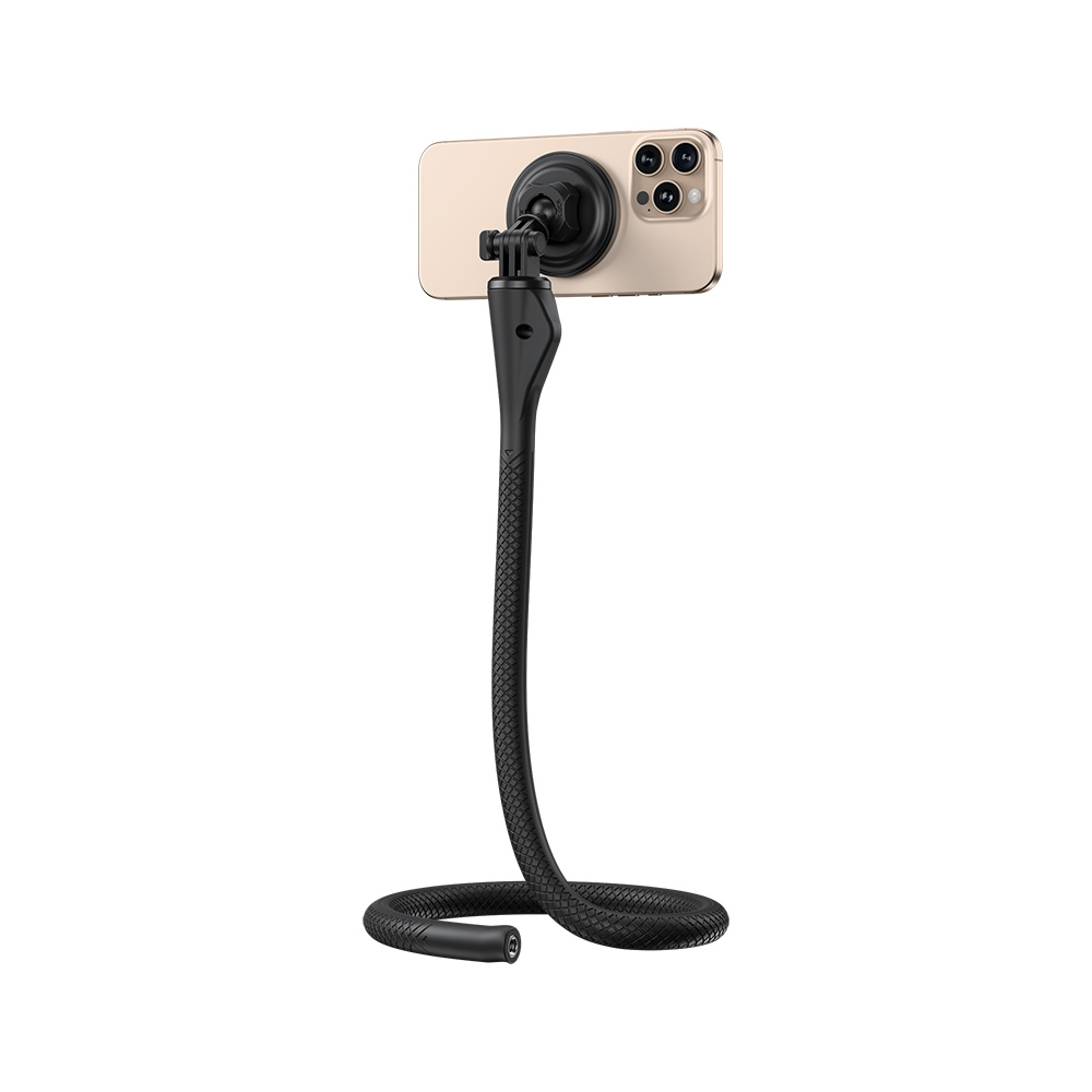 Kiorafoto MS-LA magnetic phone stand with flexible hose is compatible with magnetic phone and action cameras from various brands. It is an innovative and practical shooting tool suitable for outdoor live streaming, vlog recording, selfies, and more. The magnetic plate is compatible with Apple phones with MagSafe, does not interfere with side button use, and allows easy switching between horizontal and vertical screen modes. Installation is simple—attach magnetically in one second and start shooting immediately. The magnetic plate is detachable and can be replaced with a multifunctional GoPro base (sold separately), supporting connection to various brands of action cameras or other photography accessories with compatible mounts. The flexible hose stand is made of premium aluminum strips wrapped in silicone, making it flexible and durable. It can be shaped and wrapped freely to secure on desks, railings, branches, shopping carts, sports railings, and more.